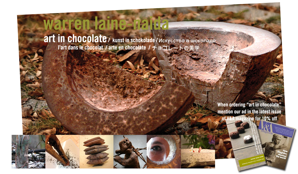 ... Die gefährlichen Materialkonglomerate aus Schokolade, Draht und Glas von Warren Laine-Naida, die sich widerspenstig dem Betrachter entgegenstellen und sich jeder sinnlich oralen Wahrnehmung verwehren, zeigen die andere Seite der süssen Schokolade. Gesellschaftspolitische und religiöse Kontexte finden ebenso Erwähnung wie die sexuelle Konnotation und die Bedeutung der Wahrnehmung dieser Kunst mit allen Sinnen - auch der Täuschung und Illusion - bis hin zur körpereigenen Erfahrung durch den Verzehr dieser Kunst.